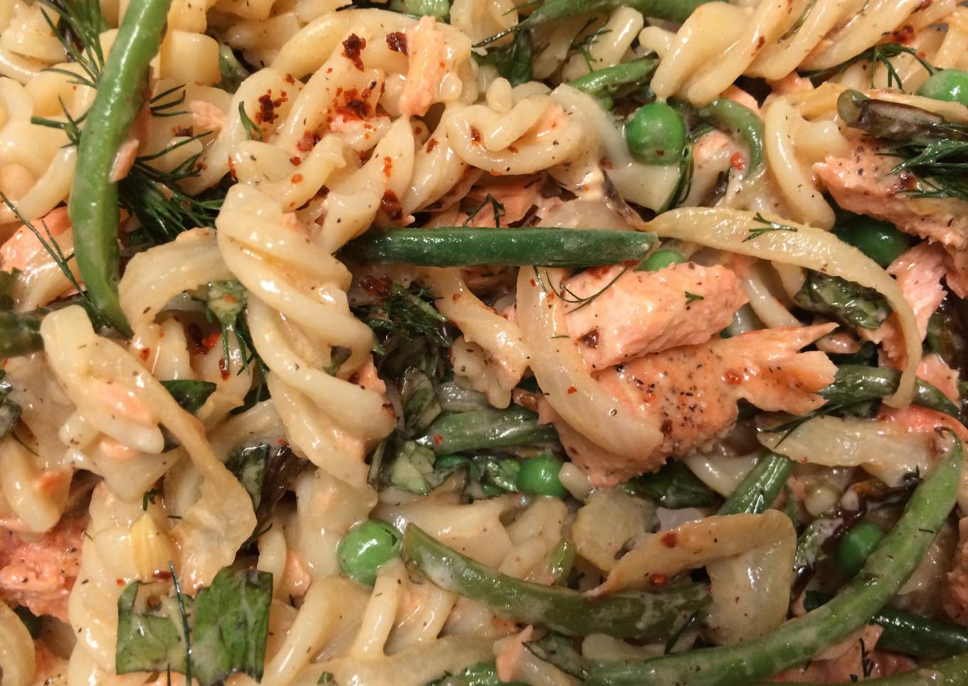 - Add sauce to pasta, toss. Flake salmon into large chunks and add pasta